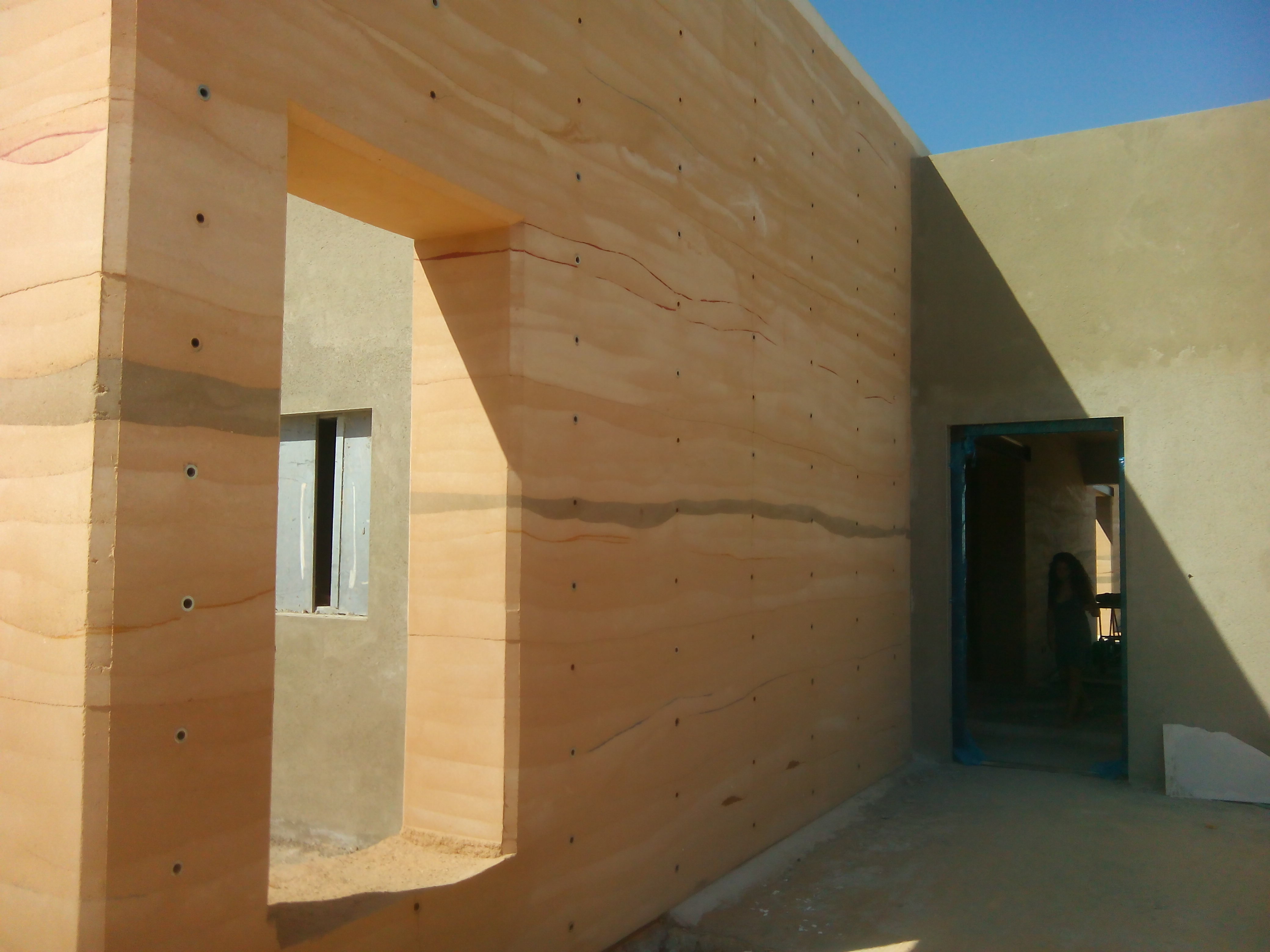 הקיר של משפחת פז תוכנן ונבנה עם גיל בעל הבית. מראה הקירות העתיקים במרוקו היו לו להשראה, ולכן הקיר מלא בחורים סימטרים, תוצאה של עבודת המיסגרות, גם היא פרי תיכנונו של גיל עם עזרתנו. אורכו של הקיר 21 מטר וגובהו 4.6 מטרים, הוא בולט אל מרפסת הכניסה ומרפסת החצר, ומציץ מעל הגג. הקיר מפריד בין המרחב הפרטי של חדרי השינה לבין הסלון והמטבח. אל הקיר ניגשים בלוקים של איטונג להשלמת הבנייה. הקיר משובץ בעדינות בשכבות צבע דקורטיביות ומראהו ססגוני ואומנותי. במרפסת, בפינה, יש לשמחת הילדים חורים המשמשים כקיר טיפוס. מתוך הקיר בולטות קורות ברזל לתמיכה בגג. גם בחלק מהמושקופים הותקנו קורות ברזל הנתמכות על ידי קורות שתולות בקיר.